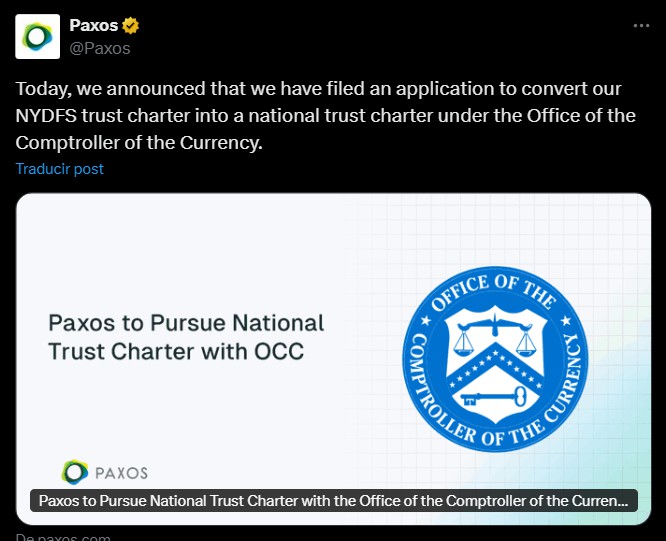 Jika disetujui, Paxos akan berada di bawah pengawasan OCC, yang memiliki kewenangan federal, bersama dengan pengawasan yang sudah ada dari FIN-FSA di Eropa, MAS di Singapura, dan FSRA di Abu Dhabi Global Market.