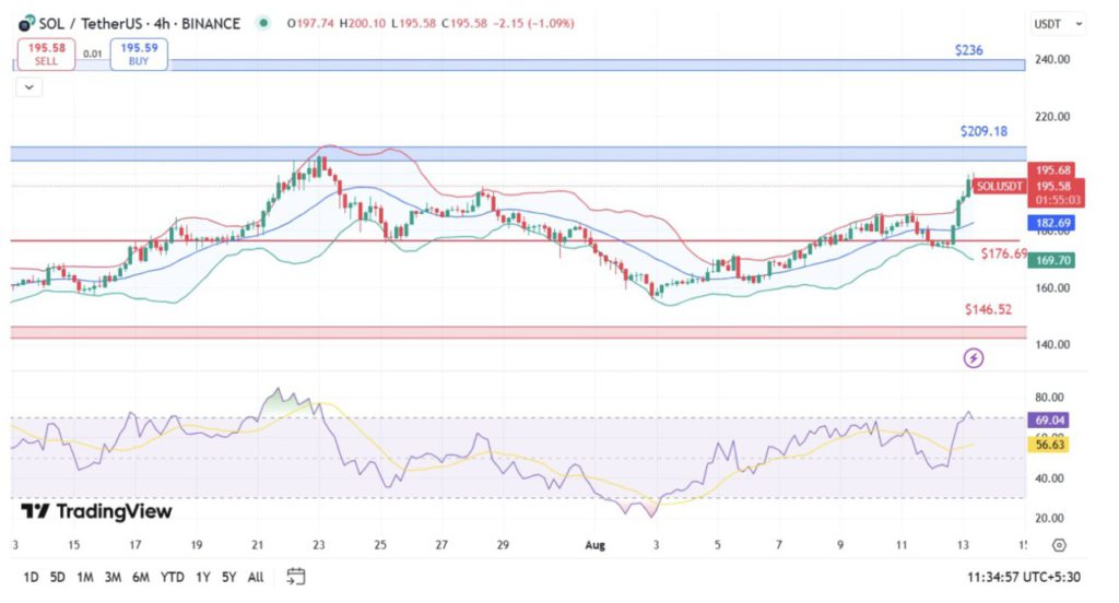 Solana diperdagangkan dengan premium 12,84% sejak kemarin di harga $197,90, dengan kapitalisasi pasar sebesar $106,8 miliar dan volume harian melonjak 73,4% menjadi $10,7 miliar.