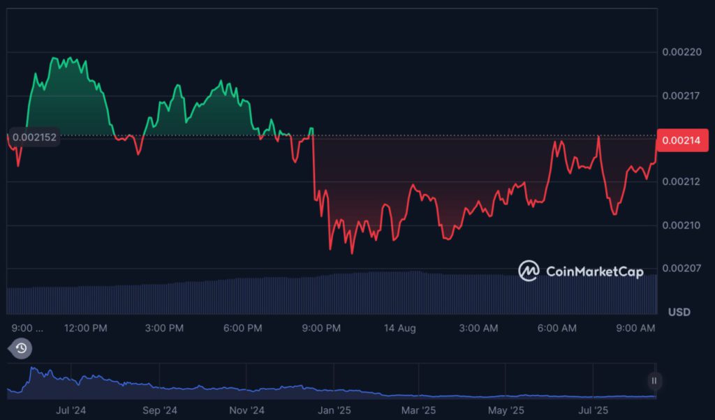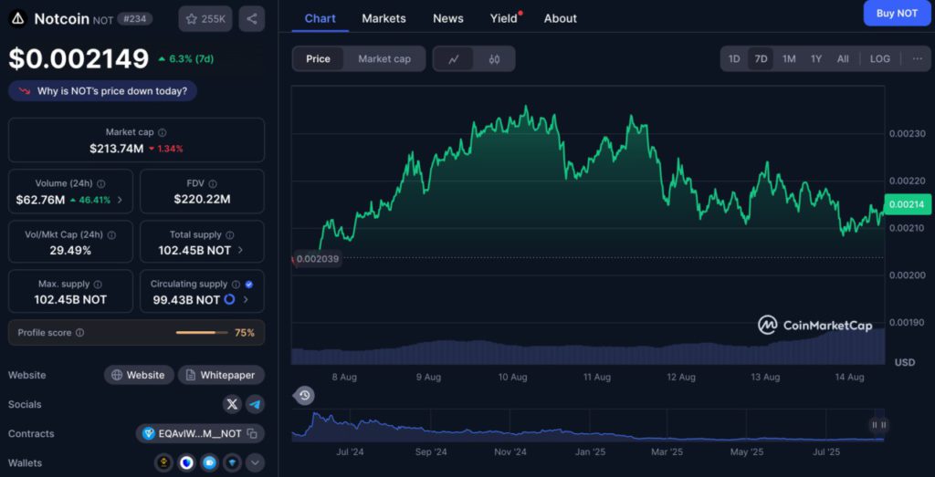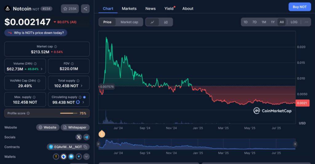 Berdasarkan data terbaru dari CoinMarketCap, harga NOT saat ini berada di level $0.002147 atau sekitar Rp34,578, mengalami penurunan sekitar 80% sejak mencapai puncaknya. Meski begitu, indikator teknikal menunjukkan adanya potensi pembalikan tren. Untuk itu, mari kita telaah lebih dalam.
