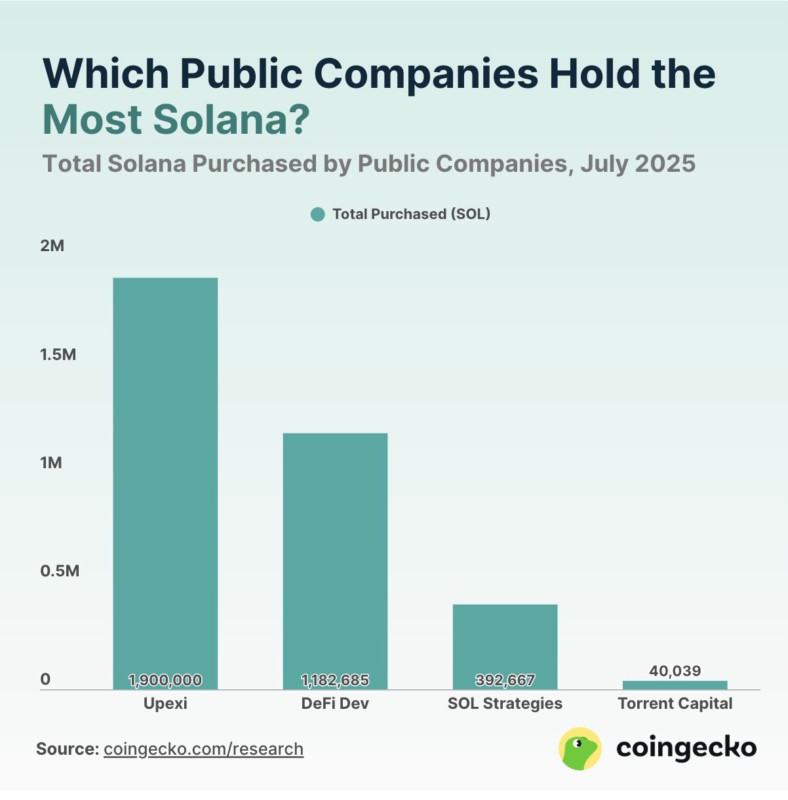 Berdasarkan studi yang dilakukan oleh Coingecko, Upexi, Inc., DeFi Developments Corp, SOL Strategies, dan Torrent Capital menjadi sorotan karena memiliki posisi SOL signifikan di portofolio mereka.