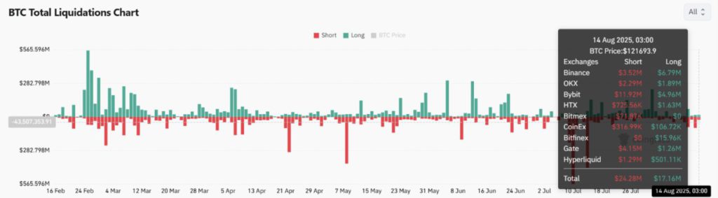 Per 14 Agustus, Bitcoin mencatat likuidasi posisi short sebesar $24,28 juta dibandingkan $17,16 juta pada posisi long, menandakan adanya forced exit dari trader yang bertaruh pada penurunan harga.