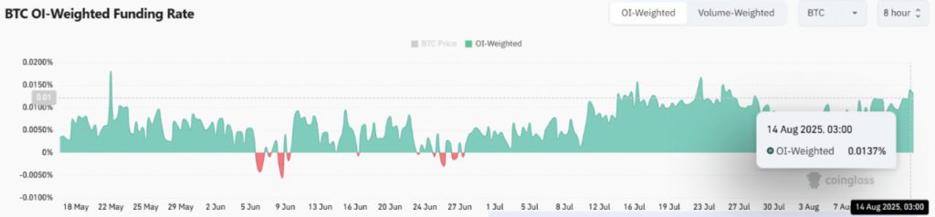 Tingkat BTC OI-weighted funding rate saat ini berada di 0,0137%, mencerminkan sentimen positif yang stabil di kalangan trader dengan posisi leverage.