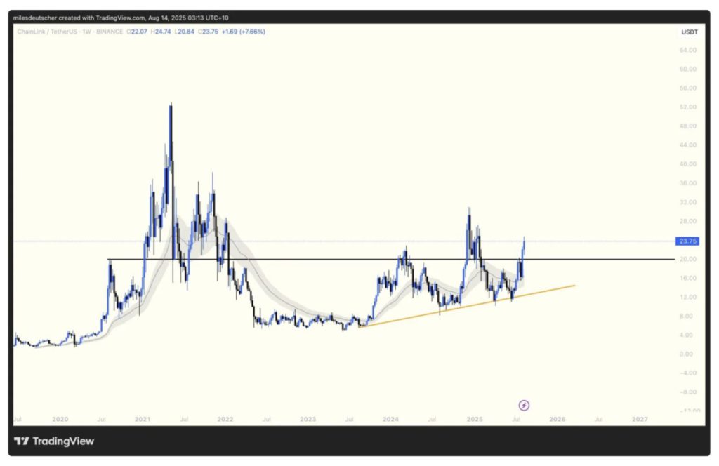 Meskipun mengalami kenaikan mingguan yang signifikan, analis crypto terkemuka, Miles Deutscher, memprediksi lebih banyak keuntungan untuk LINK, dengan alasan peran yang semakin berkembang dalam adopsi teknologi blockchain oleh institusi.