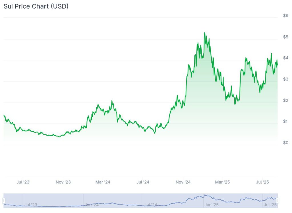 Secara keseluruhan, harga SUI telah menunjukkan pergerakan yang signifikan sejak diluncurkan, dimulai dengan harga sekitar $1 pada Juli 2023, kemudian mengalami lonjakan tajam pada Maret 2024, mencapai $5 – $6.
