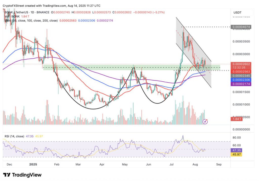 Harga Bonk turun lebih dari 12% pada 14 Agustus 2025, sempat diperdagangkan sekitar $0.000026 pada saat penulisan. Meme coin ini juga bertahan di atas resistance-turned-support pola Cup-and-Handle di sekitar $0.000025.