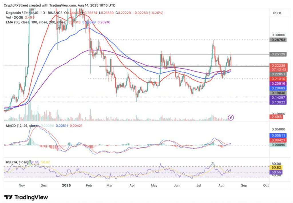 Pada 14 Agustus 2025, Dogecoin sempat bertahan di atas rata-rata pergerakan kunci, termasuk 50-day Exponential Moving Average (EMA) di $0.2131, 200-day EMA di $0.2091, dan 100-day EMA di $0.2069.