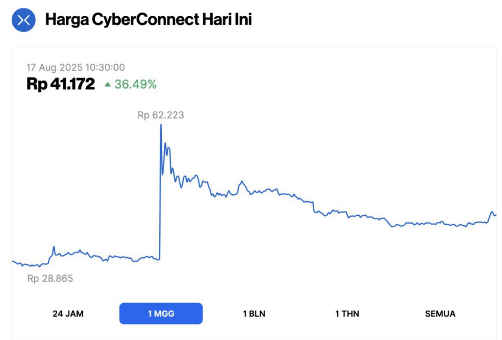 Grafik menampilkan pergerakan harga CyberConnect selama satu minggu terakhir hingga 17 Agustus 2025 pukul 10:30 WIB. Harga sempat berada di titik terendah sekitar Rp 28.865 sebelum mengalami lonjakan tajam yang mencapai puncak di Rp 62.223.