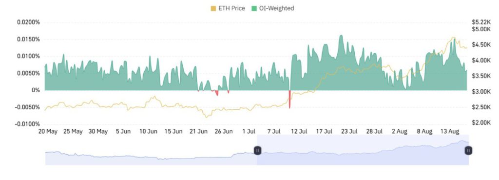 Secara keseluruhan, statistik derivatif ETH menunjukkan gambaran yang hati-hati namun stabil. Dengan open interest yang tetap kuat dan OI-weighted rate yang positif, investor tampaknya siap untuk kenaikan bertahap, meski penurunan volume perdagangan secara tiba-tiba menandakan minat perdagangan jangka pendek yang lebih rendah.