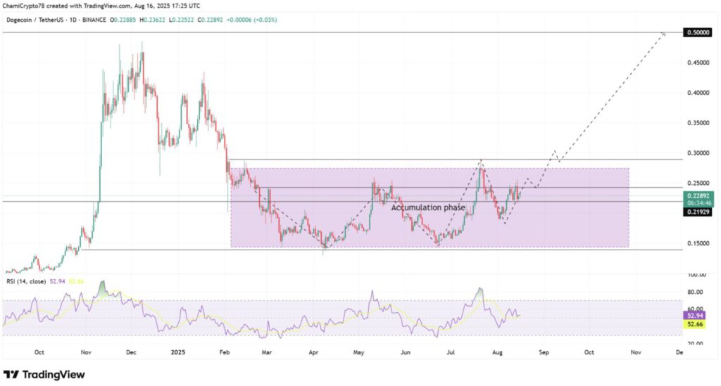 Sementara itu, Dogecoin terus diperdagangkan dalam fase akumulasi yang jelas pada grafik harian. Fase ini berada dalam rentang $0,21 di bawah hingga $0,30 di atas sejak awal Februari.