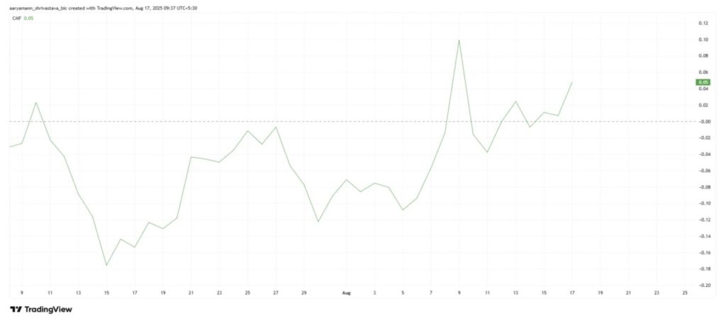 Meskipun sentimen cenderung bearish, momentum makro Pi Coin menunjukkan sedikit ketahanan. Indikator Chaikin Money Flow (CMF) saat ini berada di atas garis nol, mencerminkan adanya arus masuk modal yang lebih kuat ke aset ini.
