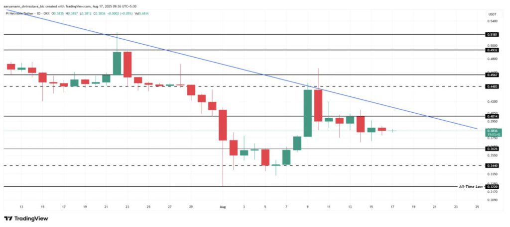 Pada 17 Agustus, Pi Network sempat diperdagangkan di $0,383, setelah baru-baru ini gagal menembus level resistensi $0,401. Ketidakmampuan untuk bergerak lebih tinggi membuat aset ini tetap terkunci dalam tren penurunan.