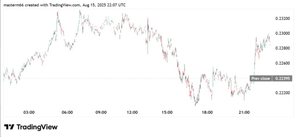 Menyusul pengajuan ETF, harga Dogecoin (DOGE) naik hampir 2,5% dalam satu hari pada 15 Agustus 2025, mencapai $0,22976 dari $0,22395. Data dari TradingView menunjukkan bahwa kenaikan harga ini terjadi menjelang akhir sesi perdagangan, mengakhiri tren sideways yang telah berlangsung.