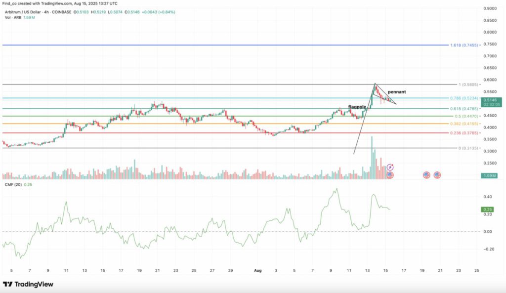 Token saat ini menguji batas atas pennant. Jika pembeli mampu mendorong harga melewati garis tren atas pennant dengan volume yang signifikan, ARB berpotensi menargetkan swing high terbaru di sekitar $0,75.