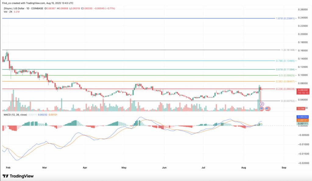 Saat ini, ZK diperdagangkan sekitar $0,064, naik 15% dalam sepekan terakhir. Meski masih sekitar 80% di bawah harga tertinggi sepanjang masa, grafik harian menunjukkan bahwa token ini berpotensi mengalami kenaikan lebih lanjut dalam beberapa minggu ke depan.