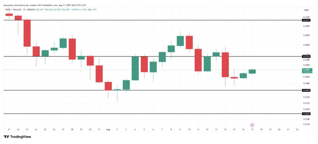 1inch menarik perhatian para investor menjelang pengumuman misterius yang dijadwalkan pada 19 Agustus 2025. Dalam unggahan resmi proyek, disebutkan tentang upaya untuk menyatukan ekosistem DeFi, memicu spekulasi di pasar.
