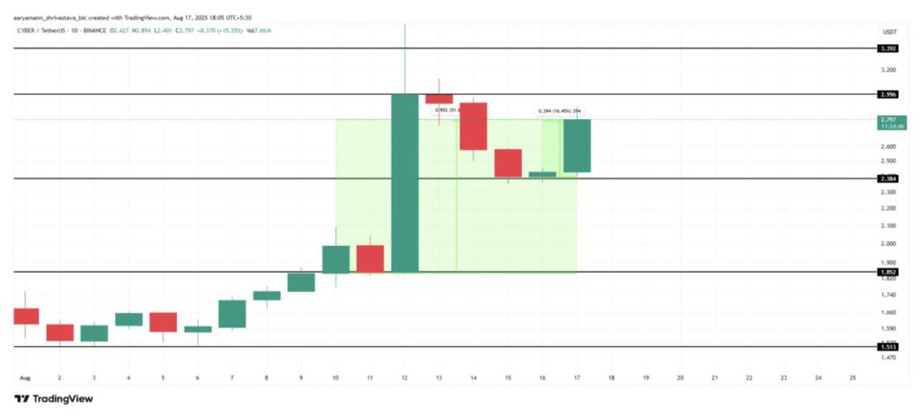 Momentum bullish masih berlanjut, dengan CYBER mencatat kenaikan 16,45% dalam pada 17 Agustus 2025. Diperdagangkan pada $2,79 saat laporan dibuat, altcoin ini berpotensi menembus $2,99.