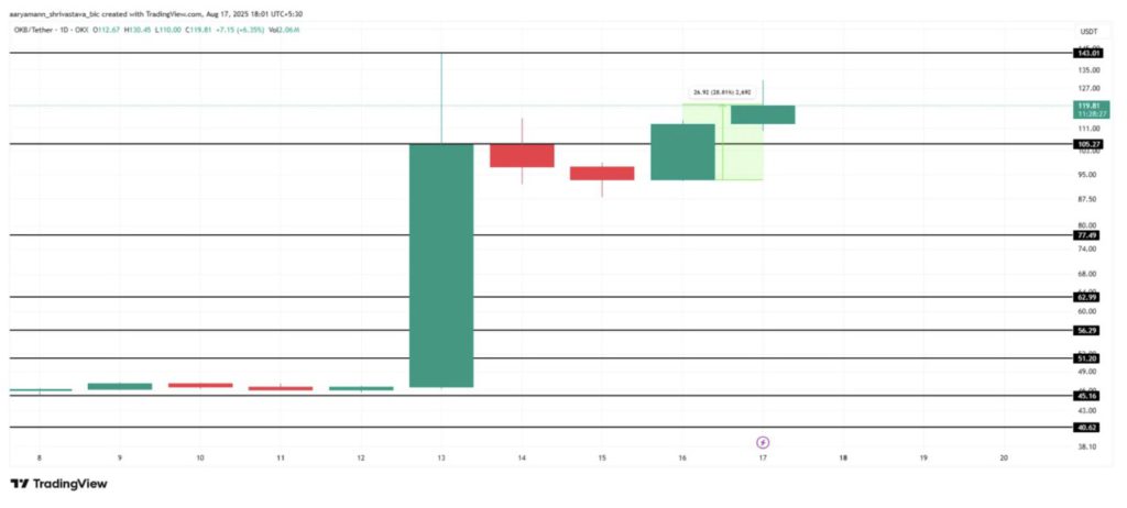 Per 17 Agustus, harga OKB sempat melonjak 28%, mencapai $119 pada saat laporan dibuat. Jika momentum bullish ini bertahan, altcoin ini berpotensi melanjutkan kenaikan menuju $143 atau bahkan level yang lebih tinggi, menandakan kepercayaan investor yang kembali meningkat.