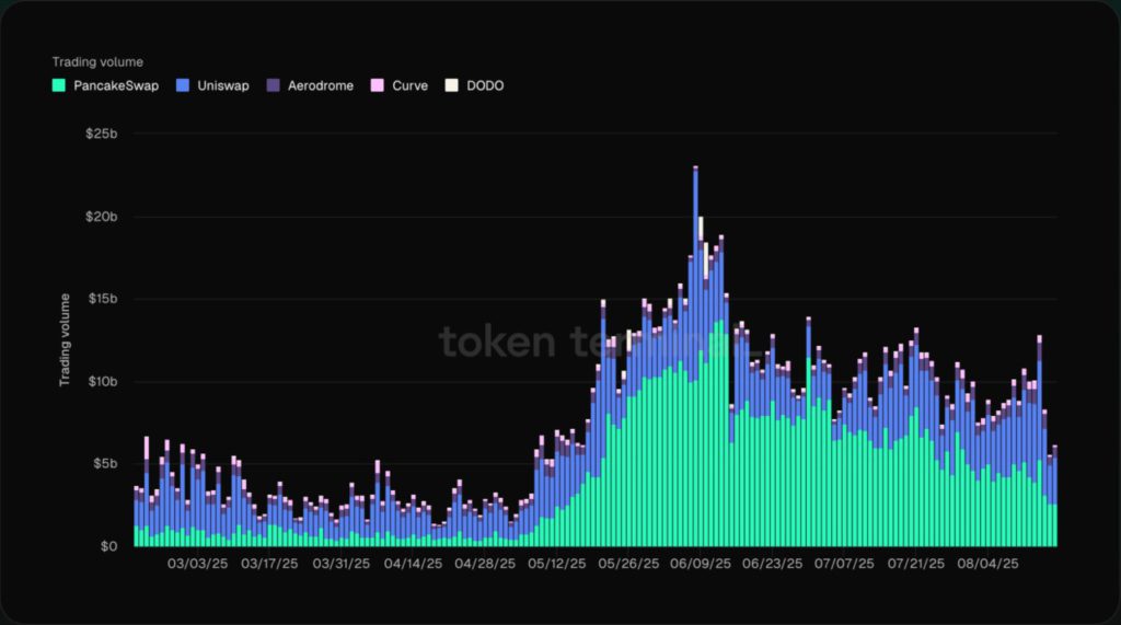 Volume trading di decentralized exchange (DEX) seperti PancakeSwap, Uniswap, Aerodrome, Curve, dan DODO mencatatkan pertumbuhan besar sejak Mei 2025. PancakeSwap mendominasi dengan volume transaksi mencapai belasan miliar dolar AS per hari atau sekitar Rp162 triliun.