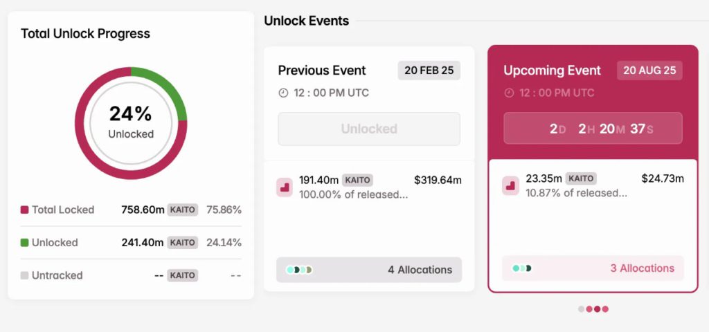 Kaito , platform informasi Web3 yang ditenagai oleh kecerdasan buatan (Artificial Intelligence), akan melepaskan 23,35 juta token KAITO pada tanggal yang sama. Token ini, yang berperan sebagai alat tukar, alat tata kelola, dan mekanisme insentif, dihargai sekitar $24,73 juta dan mewakili 9,68% dari suplai yang beredar.