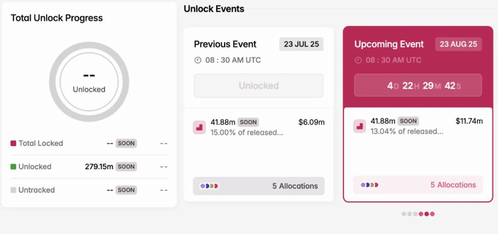 SOON, Rollup Mesin Virtual Solana (SVM) yang berkinerja tinggi, akan melepaskan 41,88 juta token yang bernilai sekitar $11,74 juta. Pelepasan ini mencakup 17,82% dari suplai yang beredar.