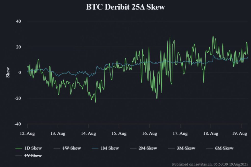Menariknya, data opsi juga menunjukkan potensi rebound yang serupa. 25 Delta Skew menurun untuk tenor 1 hari (hijau), namun naik secara stabil untuk tenor 1 bulan (biru).