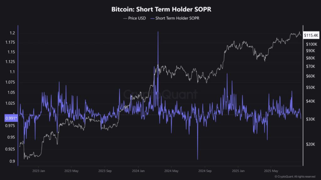Selain itu, indikator SOPR (profitabilitas) pemegang jangka pendek turun di bawah 1, menandai zona ‘buy the dip’. Indikator ini sebelumnya menunjukkan bottom dan puncak lokal di 2024 dan 2025.