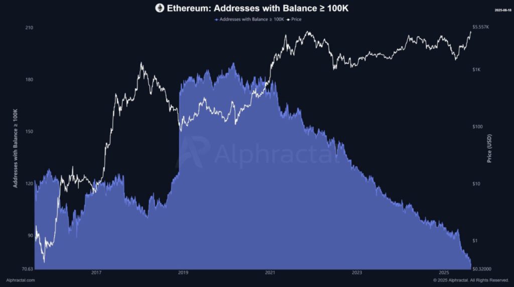 Data terbaru menunjukkan bahwa jumlah alamat yang memegang lebih dari 100.000 ETH menurun, meskipun harga ETH terus meningkat.