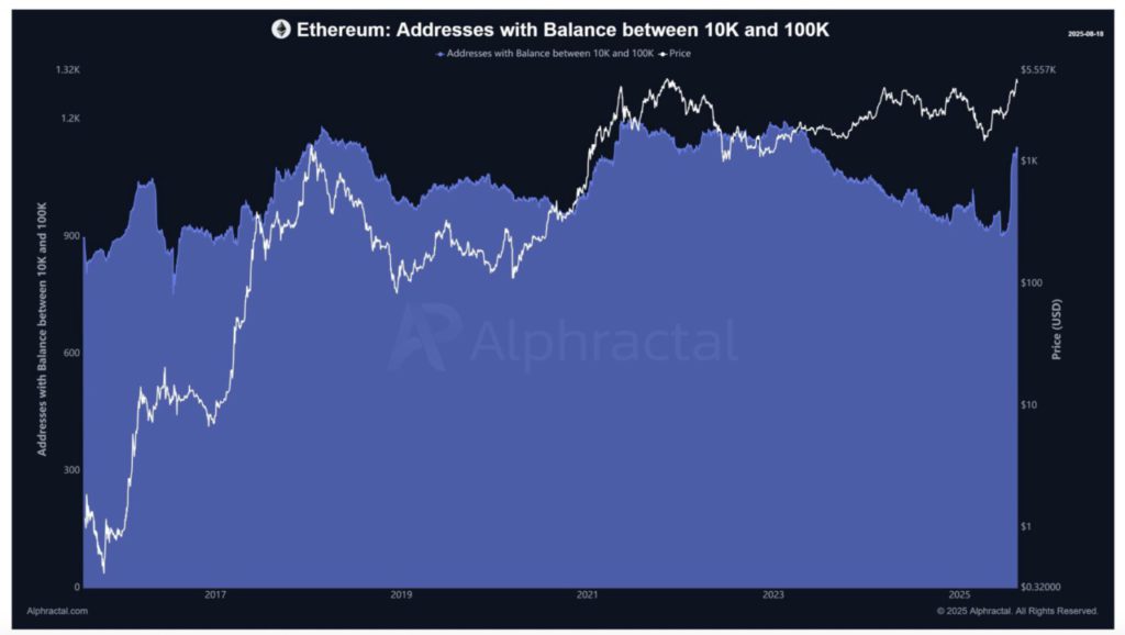 Pada bulan Agustus, jumlah dompet hiu meningkat dari sekitar 900 menjadi lebih dari 1.000. Pertumbuhan ini terjadi di tengah gelombang akumulasi Ethereum, yang didorong oleh cadangan strategis perusahaan-perusahaan publik.