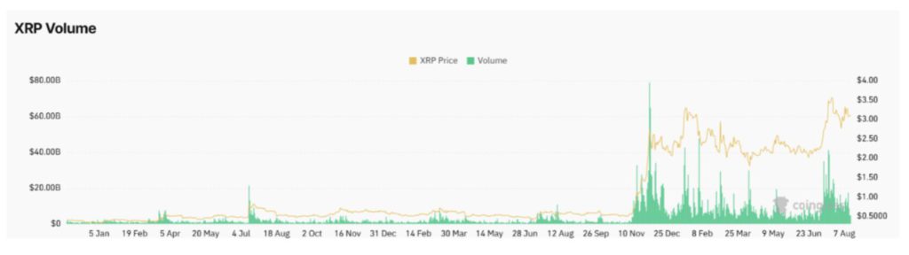 Data dari CoinGlass (18/8) menunjukkan bahwa volume perdagangan derivatif XRP melonjak 116% menjadi $9,68 miliar. Volume opsi (options) bahkan meningkat lebih tinggi, yakni 180%, mencerminkan aktivitas lindung nilai (hedging) dan spekulasi yang semakin intensif.