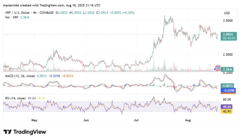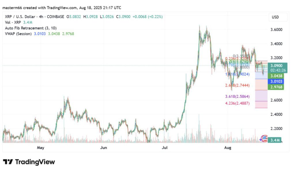 Per 18 Agustus, XRP diperdagangkan secara sideways di kisaran harga $3,09, dengan puncak terbaru berada di level yang kurang lebih sama. Level support terdekat untuk token ini berada pada $3,05. Indikator Fibonacci retracement menunjukkan beberapa area penting yang perlu diperhatikan.
