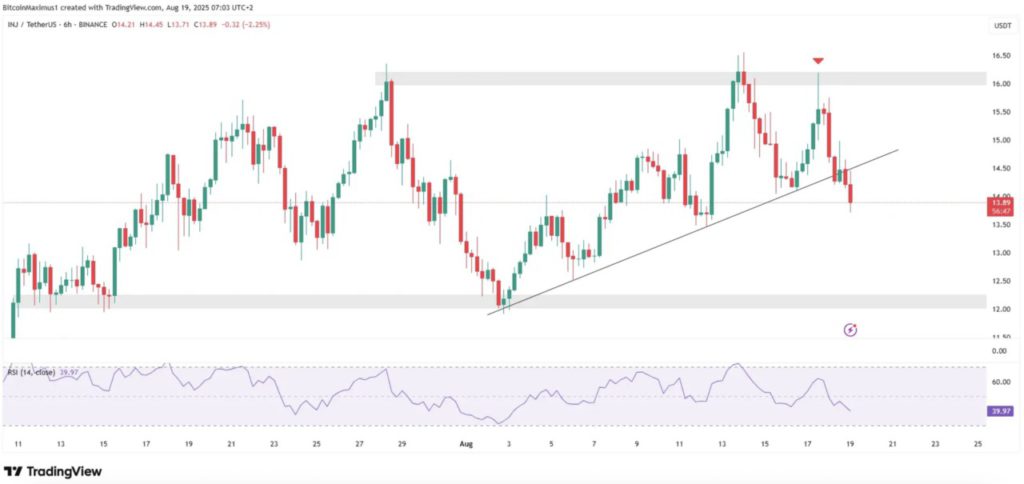 Jika tren turun berlanjut, INJ berpotensi jatuh ke area support horizontal di sekitar $12,10.