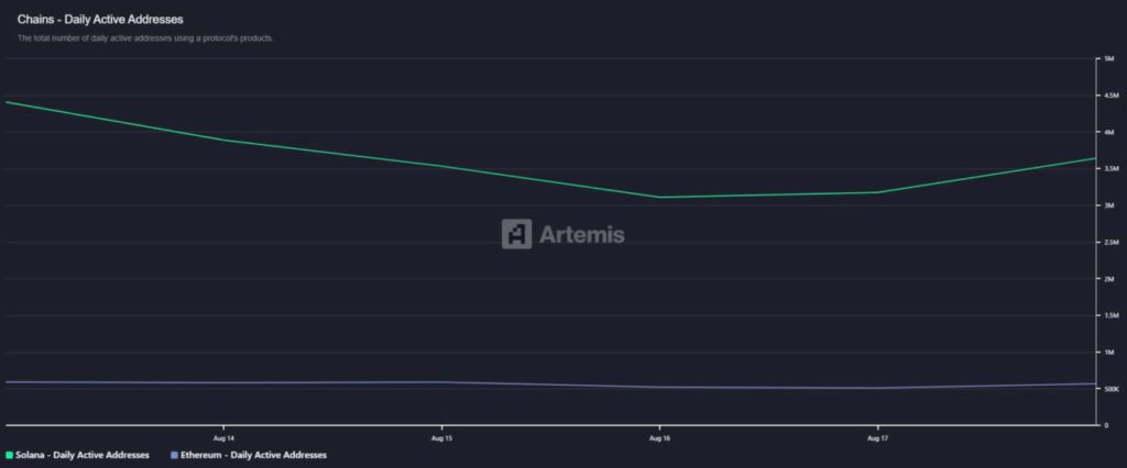 Dari sisi on-chain, Solana menunjukkan beberapa tanda kekuatan. Meskipun alamat aktif harian Solana turun hampir 18% minggu ini, dibandingkan dengan penurunan 4,2% dari Ethereum, jumlah alamat aktif Solana telah meningkat dari 3,1 juta menjadi 3,6 juta dalam tiga hari terakhir. Ini menambahkan sekitar 500.000 alamat aktif, jumlah yang kira-kira sama dengan total aktivitas yang dilihat oleh Ethereum.
