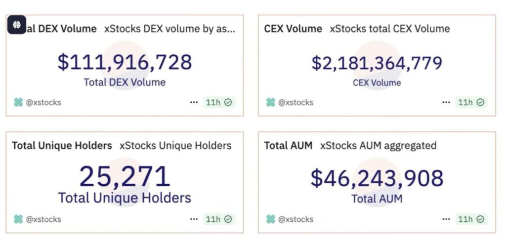 Dalam kurun waktu hanya enam minggu, xStocks berhasil mencatat volume perdagangan kumulatif sebesar $2,1 miliar, termasuk $500 juta yang berlangsung on-chain, dengan lebih dari $110 juta diperdagangkan di bursa terdesentralisasi (DEX).