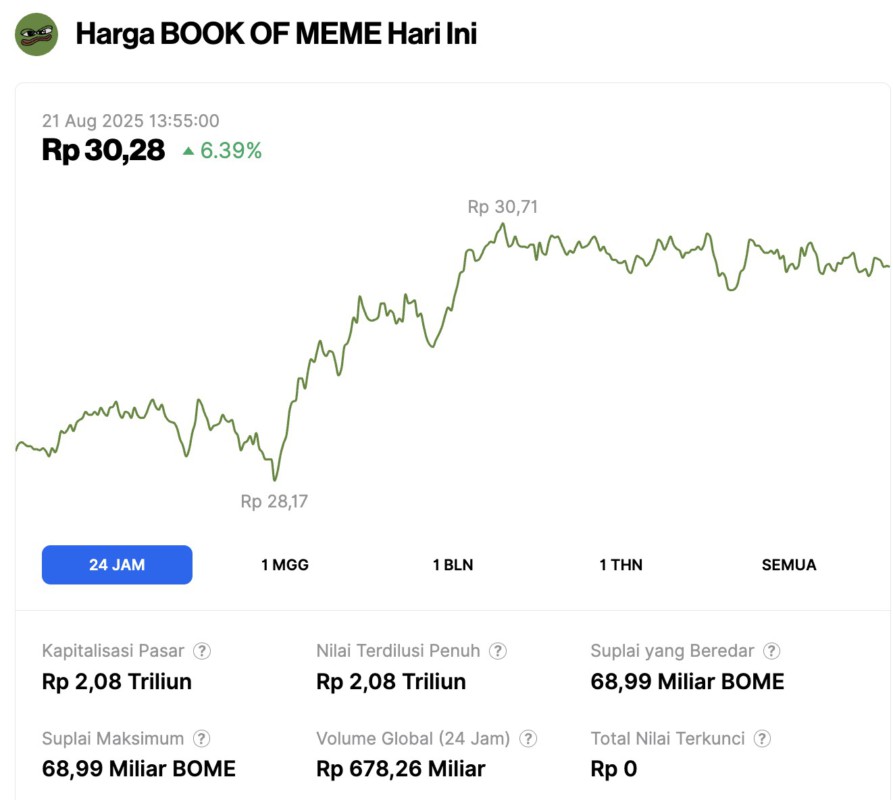 BOOK OF MEME , menempati posisi ketiga dalam kategori meme coin yang mengalami kenaikan hari ini. Melonjak 6,39% dalam waktu 24 jam terakhir, BOME diperdagangkan di sekitar Rp30,28. Dalam periode ini, BOME sempat menyentuh harga terendahnya Rp28,17 dan harga tertingginya di Rp30,71.