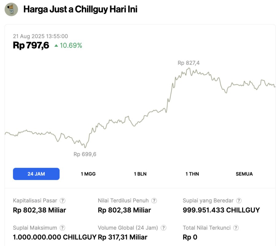 Saat ini, kapitalisasi pasar Just a Chillguy mencapai Rp802,38 miliar, dengan volume perdagangan harian yang berada di sekitar Rp317,31 miliar.