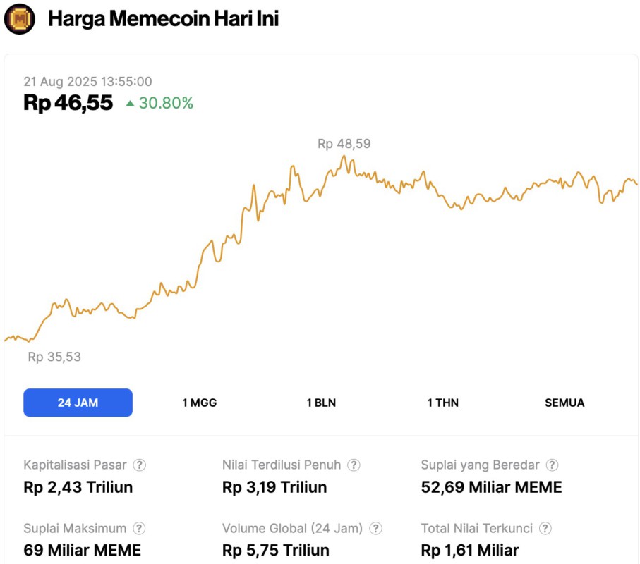 Saat penulisan, kapitalisasi pasar Memecoin sebesar Rp2,43 triliun, dengan volume perdagangan harian yang mencapai Rp5,75 triliun.