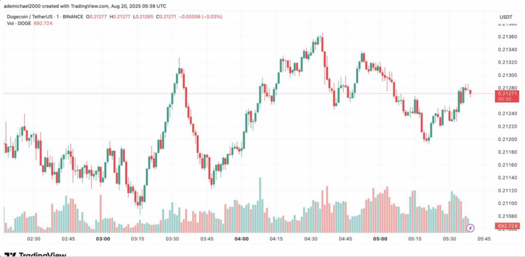 Sementara itu, Dogecoin sendiri mengalami tekanan jual dalam penurunan pasar kripto yang lebih luas. DOGE turun 1,09% pada 20 Agustus menjadi $0,213, memperpanjang penurunan mingguan lebih dari 11%.