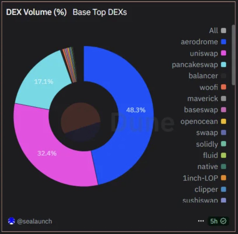 Sejak Coinbase mengintegrasikan decentralized exchange (DEX) Aerodrome ke dalam aplikasi utamanya, Aerodrome kini menguasai 48,3% volume DEX di jaringan Base, bahkan melampaui nama besar seperti Uniswap dan Pancakeswap .