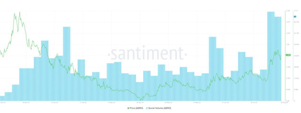 Berdasarkan data dari Santiment, volume diskusi sosial terkait AERO pada bulan Agustus mencapai titik tertinggi sepanjang masa, menandakan meningkatnya minat investor terhadap proyek ini.