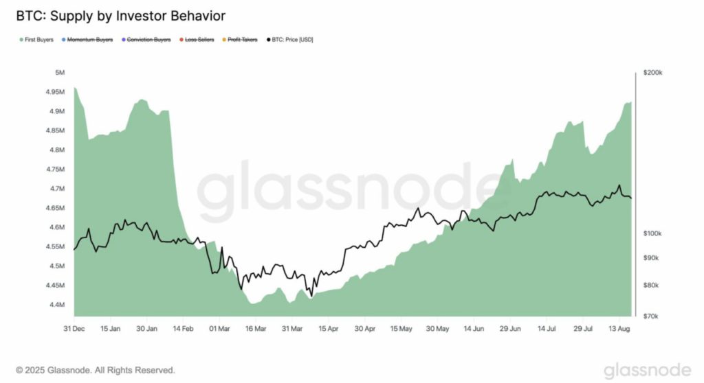Sementara itu, data Glassnode menunjukkan suplai yang dipegang oleh First Buyers mendekati 5 juta BTC, memperlihatkan bahwa pemegang jangka panjang dan pemain besar sedang melakukan strategi dollar-cost averaging (DCA) secara agresif di tengah penurunan harga.
