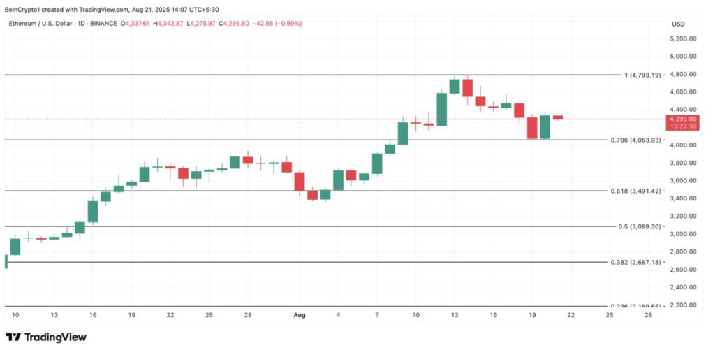 Pada saat tulisan ini dibuat, ETH diperdagangkan di level $4.295. Jika tekanan jual semakin kuat, altcoin ini berpotensi menguji kembali level support di $4.063. Jika titik harga kunci tersebut jebol, ETH bisa anjlok hingga $3.491.
