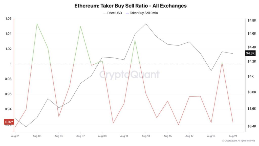 Sejak awal Agustus, rasio taker buy/sell ETH sebagian besar tetap berada di bawah satu, menegaskan adanya gelombang aksi jual berkelanjutan dari para trader futures.