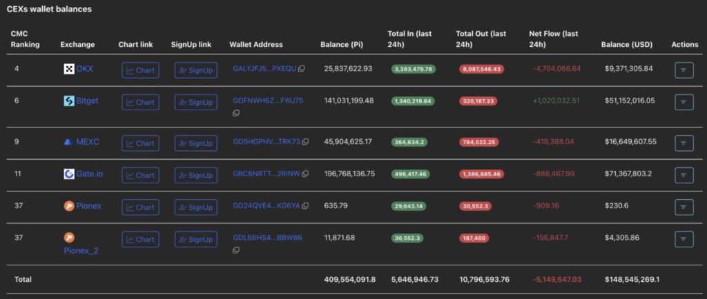 Data PiScan memperlihatkan saldo wallet CEX mencatat arus keluar sebesar 5,14 juta token PI dalam 24 jam terakhir, sehingga cadangan turun menjadi 409,55 juta token. Penarikan besar ini setara dengan penurunan 1,24% dari total saldo CEX, menandakan lonjakan permintaan dari para investor.