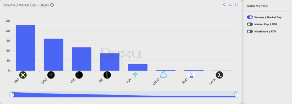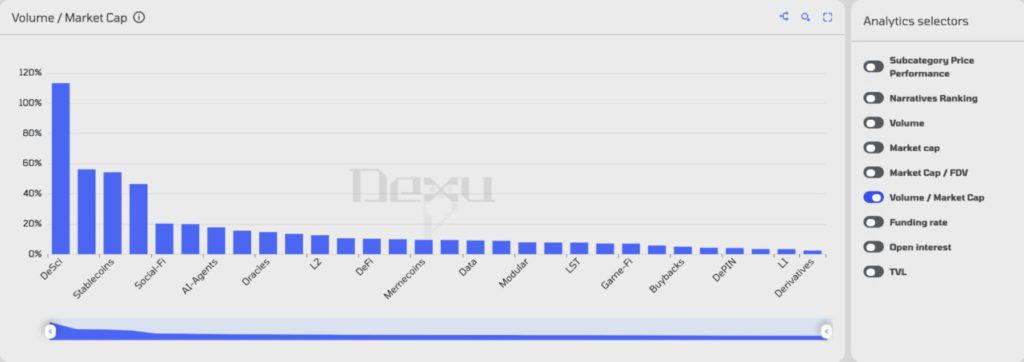 Berdasarkan grafik Volume/Market Cap, kategori DeSci (Decentralized Science) mencatat rasio lebih dari 110%. Artinya, dalam 24 jam terakhir, volume perdagangan token DeSci melampaui nilai kapitalisasi pasarnya sendiri.