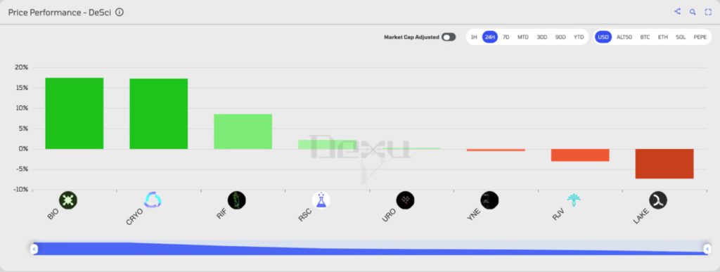 Data terbaru dari Dexscreener memperlihatkan bahwa DeSci adalah kategori terpanas saat ini, baik dari sisi volume perdagangan maupun performa harga token. Dengan BIO dan CRYO sebagai pemimpin tren, sektor ini diperkirakan akan terus menarik perhatian investor, terutama karena menggabungkan elemen riset ilmiah dengan mekanisme tokenisasi blockchain.
