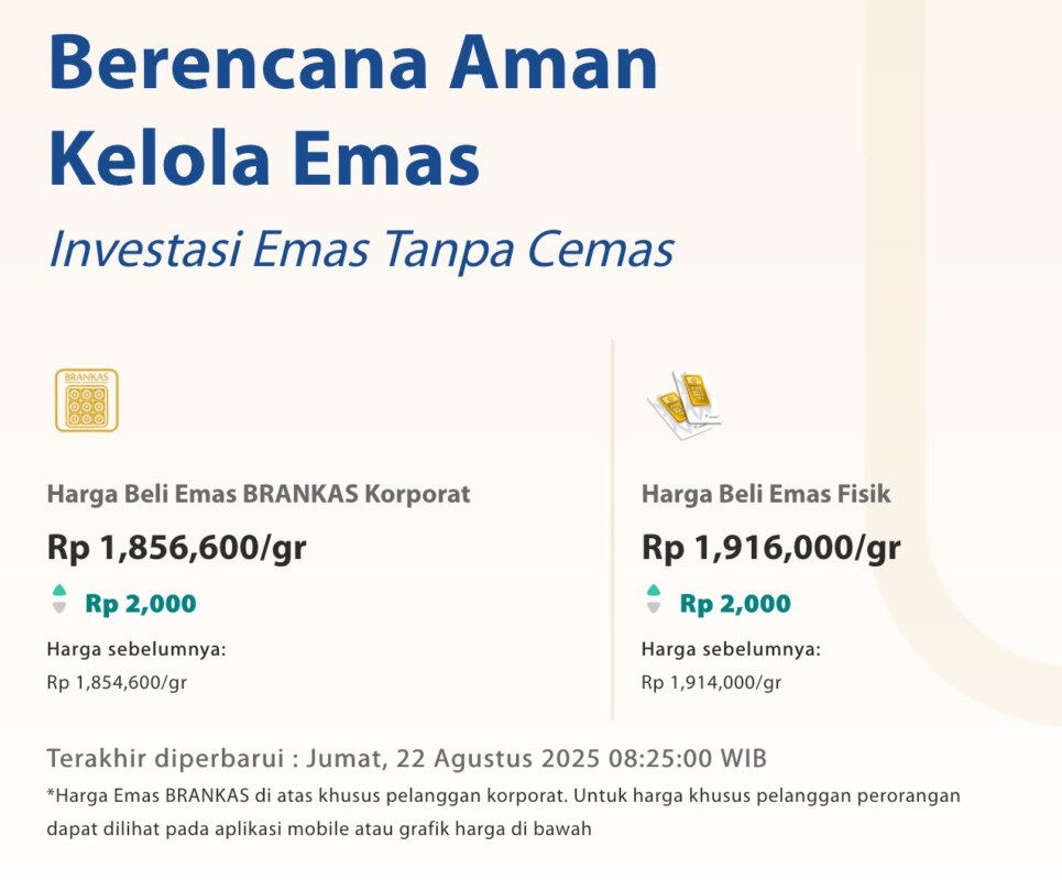 Berdasarkan data dari BRANKAS LM per Jumat, 22 Agustus 2025 pukul 08:25 WIB, harga beli emas Antam tercatat di Rp1.856.600 per gram untuk BRANKAS korporat dan Rp1.916.000 per gram untuk emas fisik. Keduanya mengalami kenaikan sebesar Rp2.000 dibandingkan hari sebelumnya.