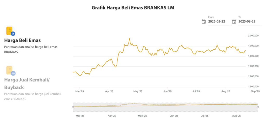 Jika melihat grafik harga emas BRANKAS dari 22 Februari 2025 hingga 22 Agustus 2025, tren menunjukkan fluktuasi yang cukup dinamis. Pada awal Maret 2025, harga emas masih berada di kisaran Rp1.650.000 per gram, kemudian sempat melonjak tajam pada April 2025 hingga menembus Rp1.900.000 per gram.