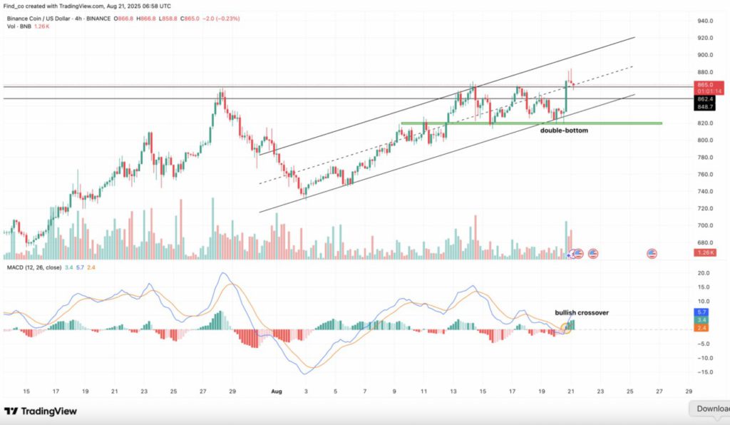 Selain formasi double-bottom, indikator Exponential Moving Averages (EMA) juga kembali memberikan sinyal bullish yang memperkuat reli BNB. Pada 14 Agustus, grafik 4 jam sempat menunjukkan terbentuknya death cross.