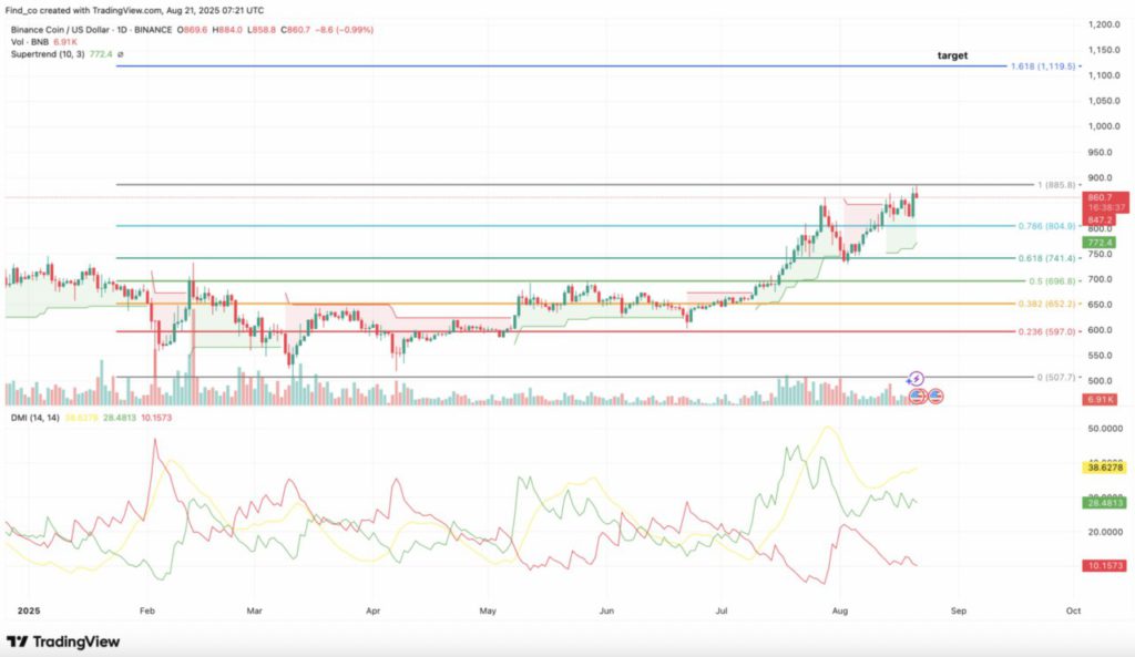 Melihat ke depan, harga BNB masih menunjukkan tren bullish. Pada grafik harian, indikator Supertrend menampilkan garis hijau yang berada di bawah harga, menegaskan sinyal beli berkelanjutan.