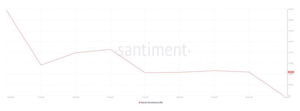 Menurut data dari Santiment, dominasi sosial PI turun drastis hingga menyentuh level terendah mingguan di angka 0,096%. Hal ini menunjukkan penurunan tajam dalam relevansi altcoin tersebut di tengah diskusi komunitas kripto selama periode pengamatan.